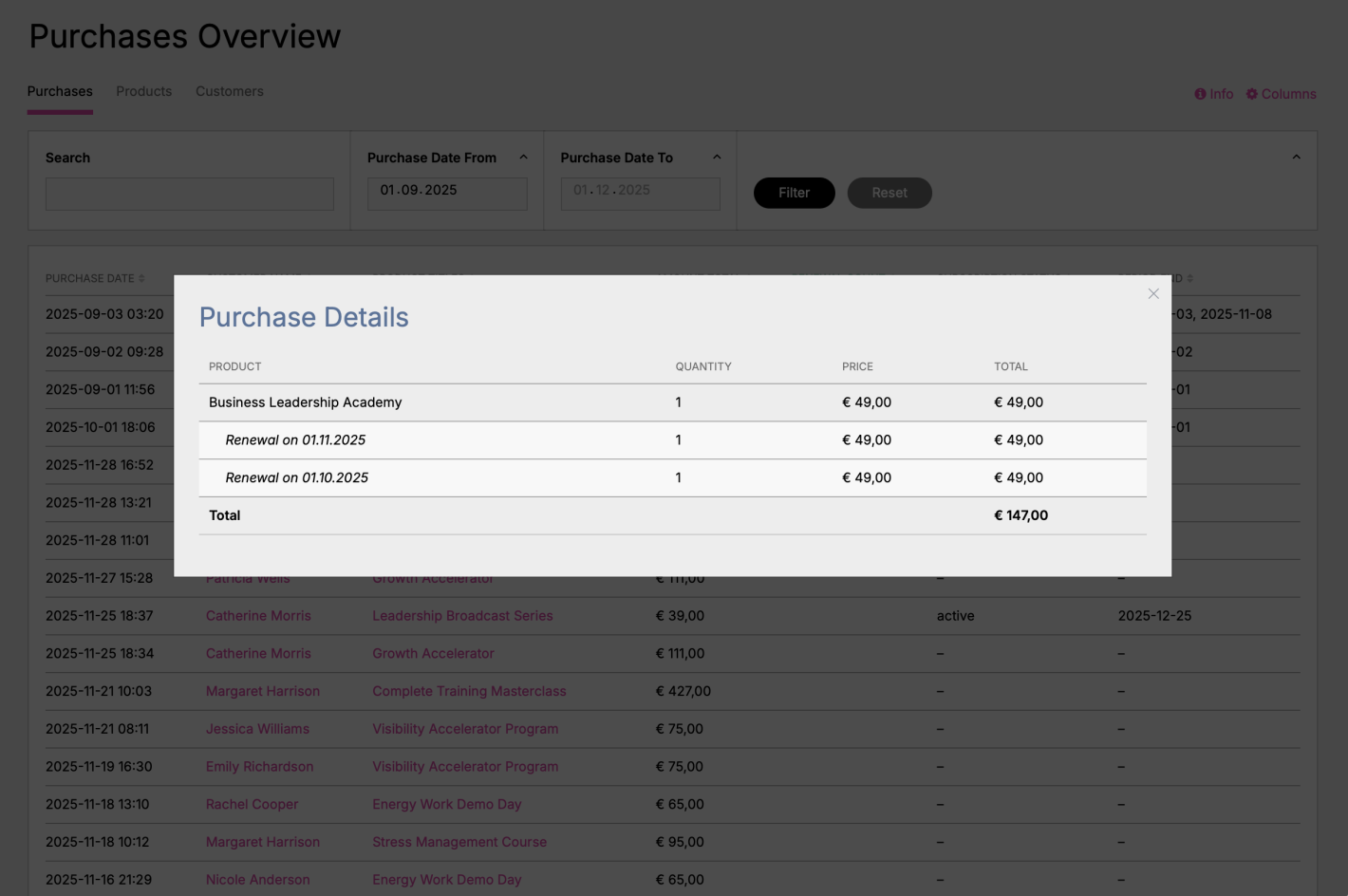 Each view has configurable columns and filters, search and filtering feature, interactive modals for viewing more detailed information, automatic calculated totals, and a CSV export feature. Combined, they provide a proper bird's-eye view of your entire store.